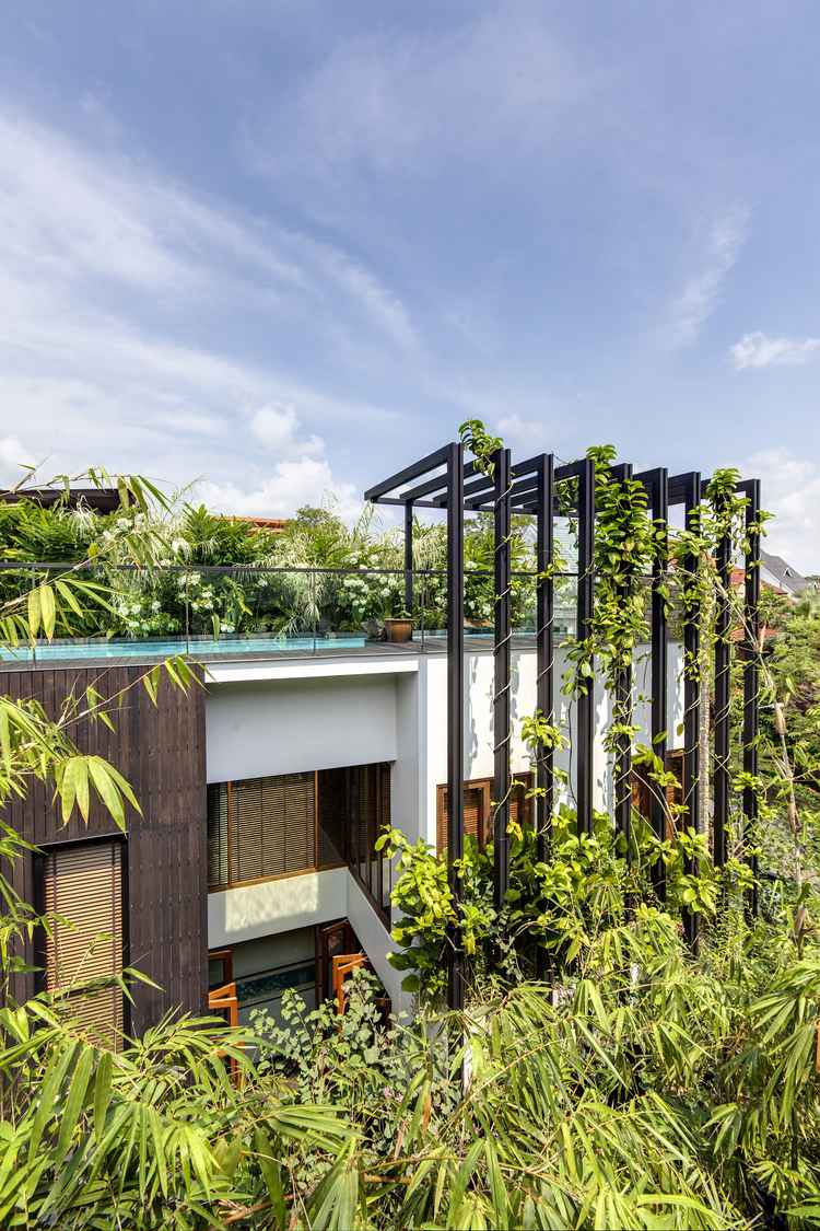 另外,業主對住宅的花園和綠化一直很重視。前兩所住宅中種的樹已經超過木陽臺了,這次在垂直的木棚架上種上了很多攀援植物,可以一直長到屋頂的游泳池。連住宅的浴室也都面向花園,能看到蔥郁的花和蝴蝶飛舞,這是一個真正的垂直花園別墅。