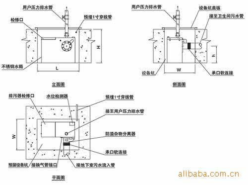 金利潔牌污水提升器則從根本上解決了環保的難題。該設備除了水泵、水箱、進出水口等必備的材料以外,還配有一個雜物分離器,不要小看這個分離器,解決難題的重點就在這里。污水和雜物進入水箱前,通過進水口的止回閥,先進入雜物分離器中,雜物被隔離在這里,污水通過過濾網、泵腔進入水箱,當水箱中的水位達到一定高度的時候,水泵啟動,水箱中的污水收到壓力先是被排到分離器中,由于水泵排水的壓力大于進水壓力,所以進水止回閥自動關閉,同時出水止回閥自動打開,污水和雜物被一同排出。利用這種反沖器的原理,可以避免雜物在污水提升器中于水泵接觸,也就不存在纏繞和沉積堵塞管道的現象,更不需要清掏,對室內環境造成污染了。