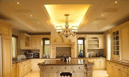 與普通戶型相比別墅廚房的面積大、層高(徑向)較高,通常都在3米以上。房主經常在這里舉行PARTY等聚會活動。作為一個社交場所,在設計廚房時充分地利用高度方向上的空間,在滿足了基本的儲物空間、操作空間的前提下,要留有足夠的活動空間。此外,要對廚房空間進行分割,一般采用島式或者半島式布置,在島的上方可以設計鋁制吊架、實木系列吊架、玻璃吧臺等。既可以充分利用空間,又讓使用極為便利。在空間允許的情況下,可以在廚房的一側設計一排筒柜,把冰箱、烤箱、消毒柜、卷簾門全部集中在此,顯得很有氣勢。