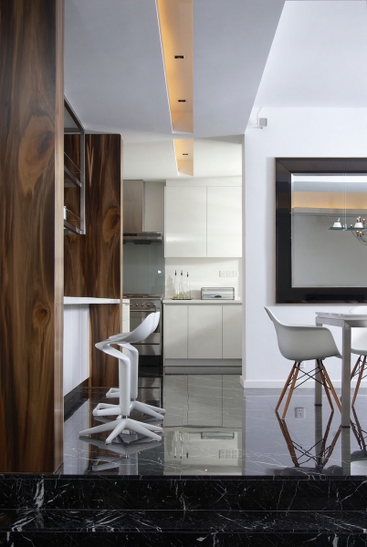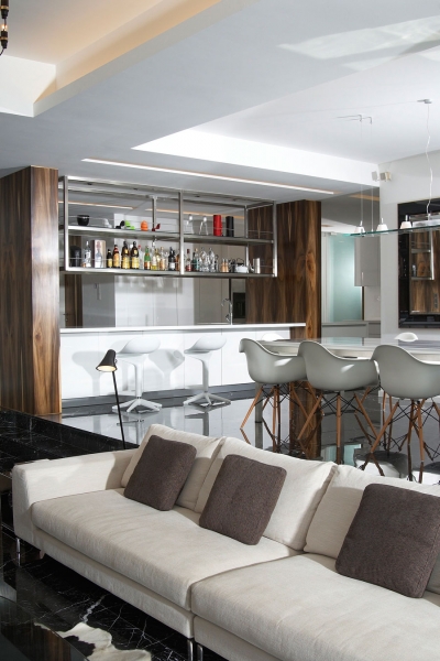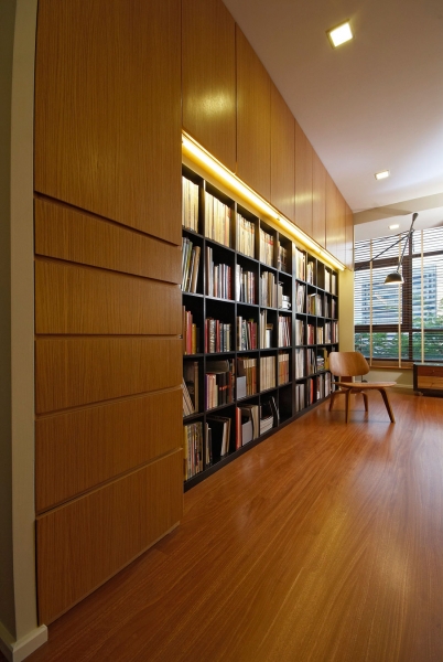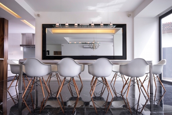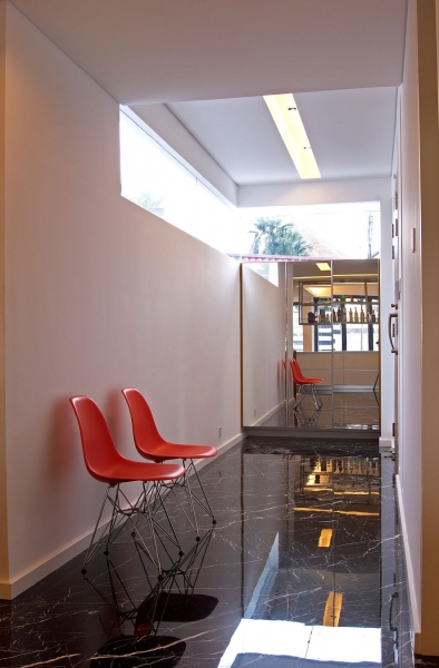 這個4500平方英尺的房子建在8000平方英尺的一個緩坡上降落。房子的方向是特殊的,因為它并不能面對服務道路,但有一個45度的傾斜。它能達到兩個目標:第一,寬度和建筑物的大小是優(yōu)化;其次,它確保隱私的人。建筑結(jié)構(gòu)保存雖然增加了一些微小的擴展。這房子被漆成白色,這樣一個能欣賞強壯的架構(gòu)形式。黑暗的鋁框玻璃窗被安裝在眾議院。以補充現(xiàn)代形式、景觀建筑都保持清潔。蓄意使用戲劇性的Serralunga盆與Zamia紙板棕櫚成為焦點的花園。