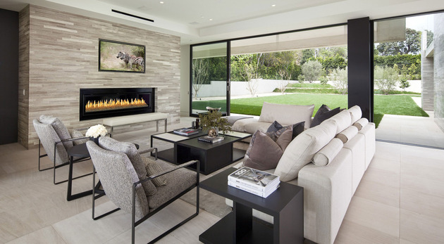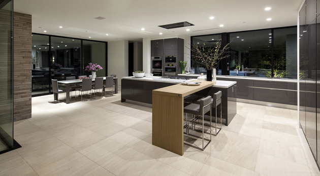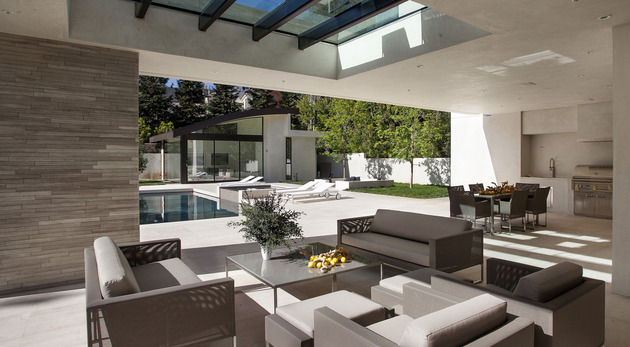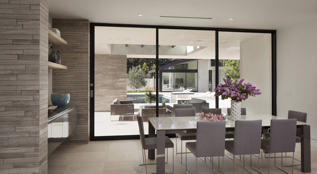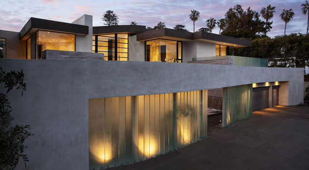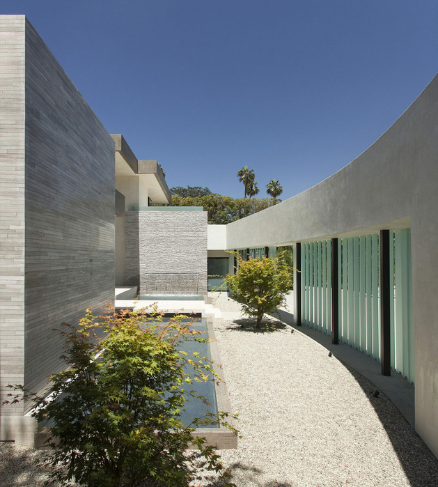 房子位于一條街道,為了減少汽車(chē)噪音影響,建筑師用高大的圍墻和大門(mén)將庭院與街道隔開(kāi),大門(mén)兩側(cè)是玻璃百葉,起到緩沖噪音的作用,同時(shí)不阻擋光線(xiàn)通過(guò)。此外,還設(shè)計(jì)了一條路和小橋,將大門(mén)和室內(nèi)連接。穿過(guò)院子時(shí),可以欣賞水景,也能聽(tīng)到瀑布?jí)Φ牧魉暎谷烁械椒浅7潘伞?br />